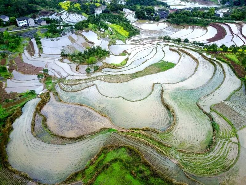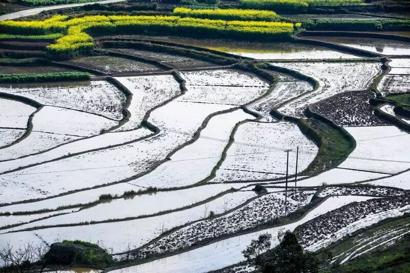 注水后的梯田会闪现出银白色的光芒,从而凸显出梯田婀娜曲折的轮廓。