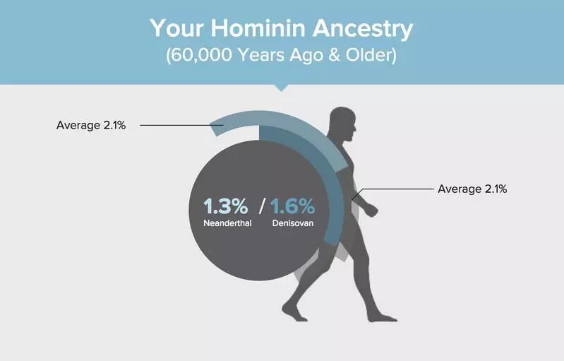 虽然古人类灭绝了,但我们每个人身上还流着他们的血。当我们的现代人祖先走出非洲到达欧亚大陆时,遇见了他们相隔了20万年的“远亲们”,由于长时间各自演化,他们已经是完全不同的人种了。现代人的身体没有古人类高大,但脑子比他们灵光,在约三万年的相处过程中,古人类通过被征服和交配彻底消失在历史的黑暗隧道中。由于古人类和我们祖先的交配,今天除了呆在非洲老家的人之外的全世界所有的人身上都有1%-4%的古人类的基因。我也不例外,如图1,我身上有1.3%的尼安德特人基因和1.6%的丹尼索瓦人基因,参加测试的75万人的平均是分别是2.1%和2.1%,我低于平均的原因在于尼人主要在欧洲和中东一带活动,我的祖先在约6万年前就离开那里了,而尼人到3万年前才灭绝,所以留在那里没走的人们后来还有三万年的机会和尼人交配,那里的土著身上的尼人基因就会更高。丹尼索瓦人目前只在西伯利亚发现,我的祖先是从南方进入中国,因而我身上丹尼索瓦人基因也小于平均值。
