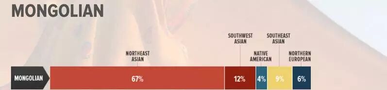 蒙古人的基因区域分布比中国人和日本人都复杂的多。出了东北亚属性和我们类似外,他们的东南亚区域基因不到我们的一半,12%。 这说明他们是从中亚草原向西进入东亚的。他们和我们和北上的祖先(他们中一部分去了东南亚)婚配就只有一半的东南亚基因。他们有9%的西南亚这也解释了他们从中亚过来的路径。看到这里,我推测我身上的2%的西南亚基因很可能是蒙古人的基因,毕竟元朝大批蒙古人进入中原。 最有意思的是他们有4%的美洲印第安人的基因,这说明他们是印第安人的祖先。最后他们还有6%的北欧人基因,这肿么回事?这是在前苏联时期来自欧洲的俄国人和当地人婚配留下的现代印记。
