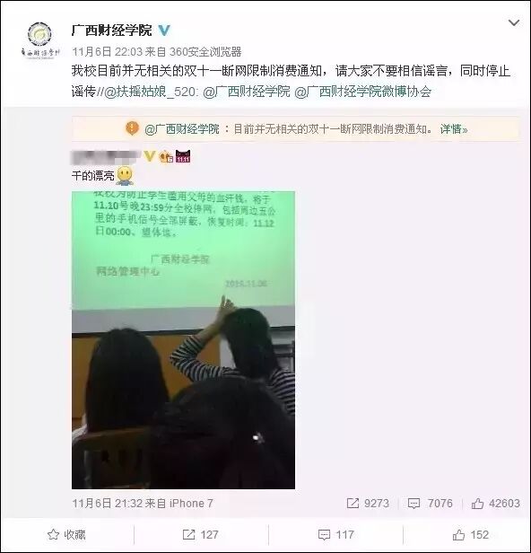 事情要从11月6日说起,当天21时32分,某微博大V 贴出一则疑似来自广西财经学院的通告,通告称,学校为防止学生“双11”滥用父母的血汗钱,将于11月10日晚23时59分全校停网,并屏蔽周边五公里的手机信号,12日零时恢复正常。“通告”的落款处写有“广西财经学院”和“网络管理中心”的字样。该条消息一经发出,就在短时间内引来围观和热议。