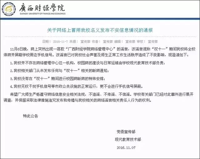 半小时后,当晚22时03分,广西财经学院官方微博对该条消息进行了紧急辟谣:我校目前并无相关的双11断网限制消费通知,请大家不要相信谣言,同时停止谣传。11月7日,校方又在学校官方网站发布“关于网络上冒用我校名义发布不实信息情况的通报”,对谣言做出了四点澄清:1.学校并不存在网络管理中心这一机构;2.学校相关部门从未发布与“双十一”相关的任何断网通知;3.学校并无在“双十一”期间断网的特殊安排;4.学校无权干扰手机信号的正常运行。
