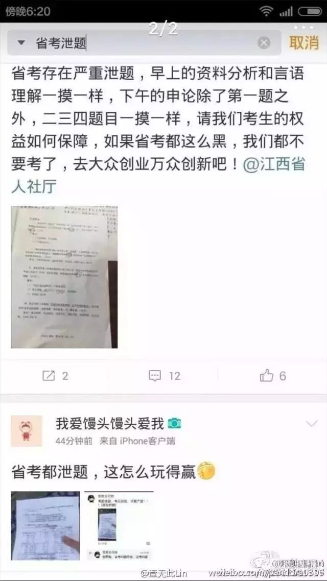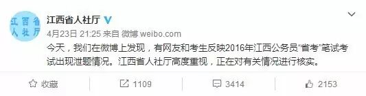 有网友在微博上反映,2016江西“省考”出现泄题,并希望求证严查,保证考生权益。