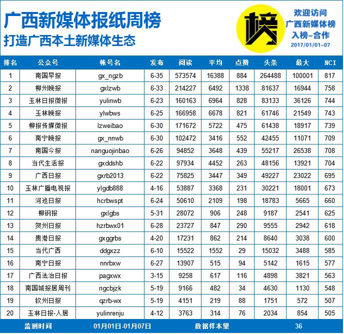 首页 | 美容百科 | 广西新媒体传媒周榜 | 2017/01/01-07 广西新媒体传媒周榜 | 2017/01/01-07 2023-04-19 23:50:29 广西新媒体榜是广西创客中心孵化的移动互联网(新媒体)项目,隶属广西新媒体研究中心,线下社群为广西新媒体联盟,联合100多位新媒体创始人,运营的新媒体超过500个。NCI计算公式