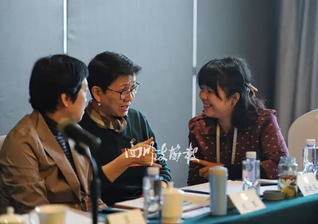 ▲高晓笛委员(中) 通过手语翻译聆听同组委员发言。本报记者 张聪 摄