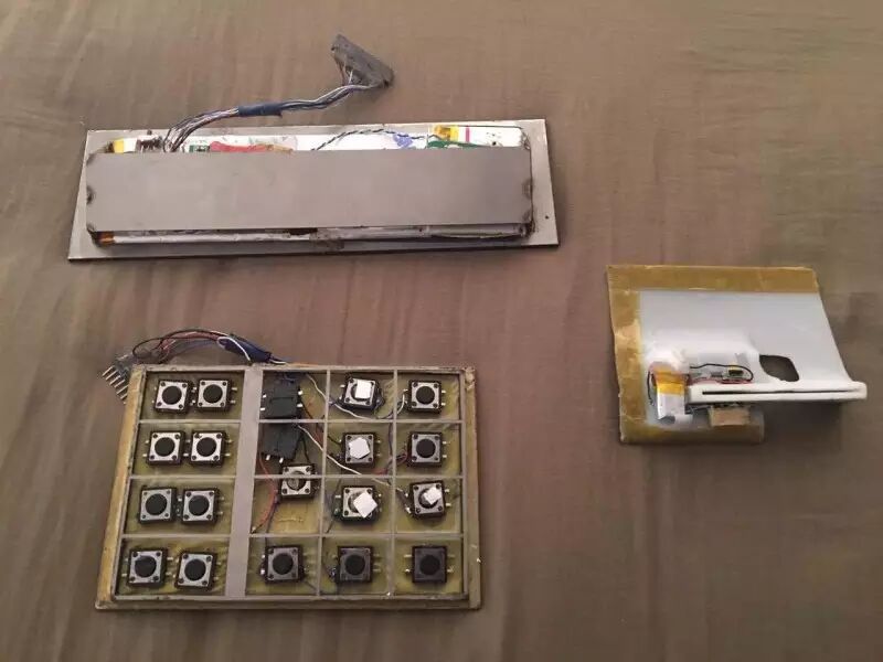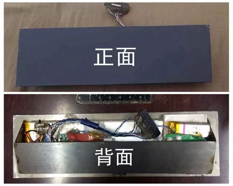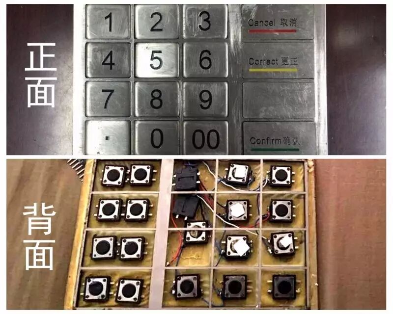 外表看不出任何端倪,像是ATM机原部件,与键盘相连接,安装在键盘面板旁的凹槽处,背面为读取存储装置。