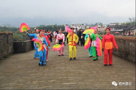 在贺街镇具有2000余年历史的临贺故城古城墙上,文艺队员在演唱彩调经典曲目《十月花》。