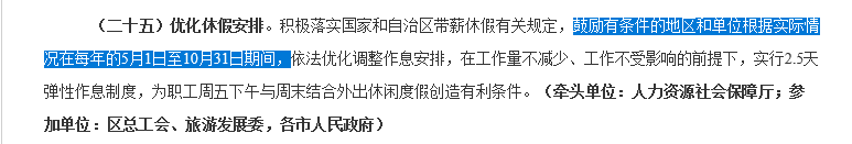 积极落实国家和自治区带薪休假有关规定,鼓励有条件的地区和单位根据实际情况在每年的 5 月1日至10月31日期间,依法优化调整作息安排,在工作量不减少、工作不受影响的前提下,实行 2.5 天弹性作息制度,为职工周五下午与周末结合外出休闲度假创造条件。