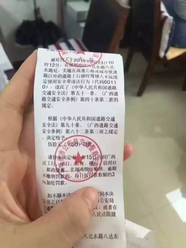 贺州网友晒出因未系安全带被处罚的单子