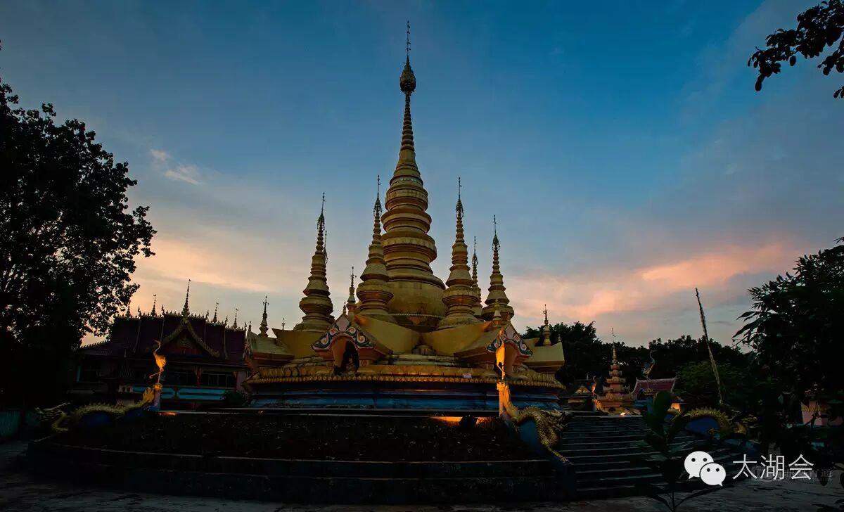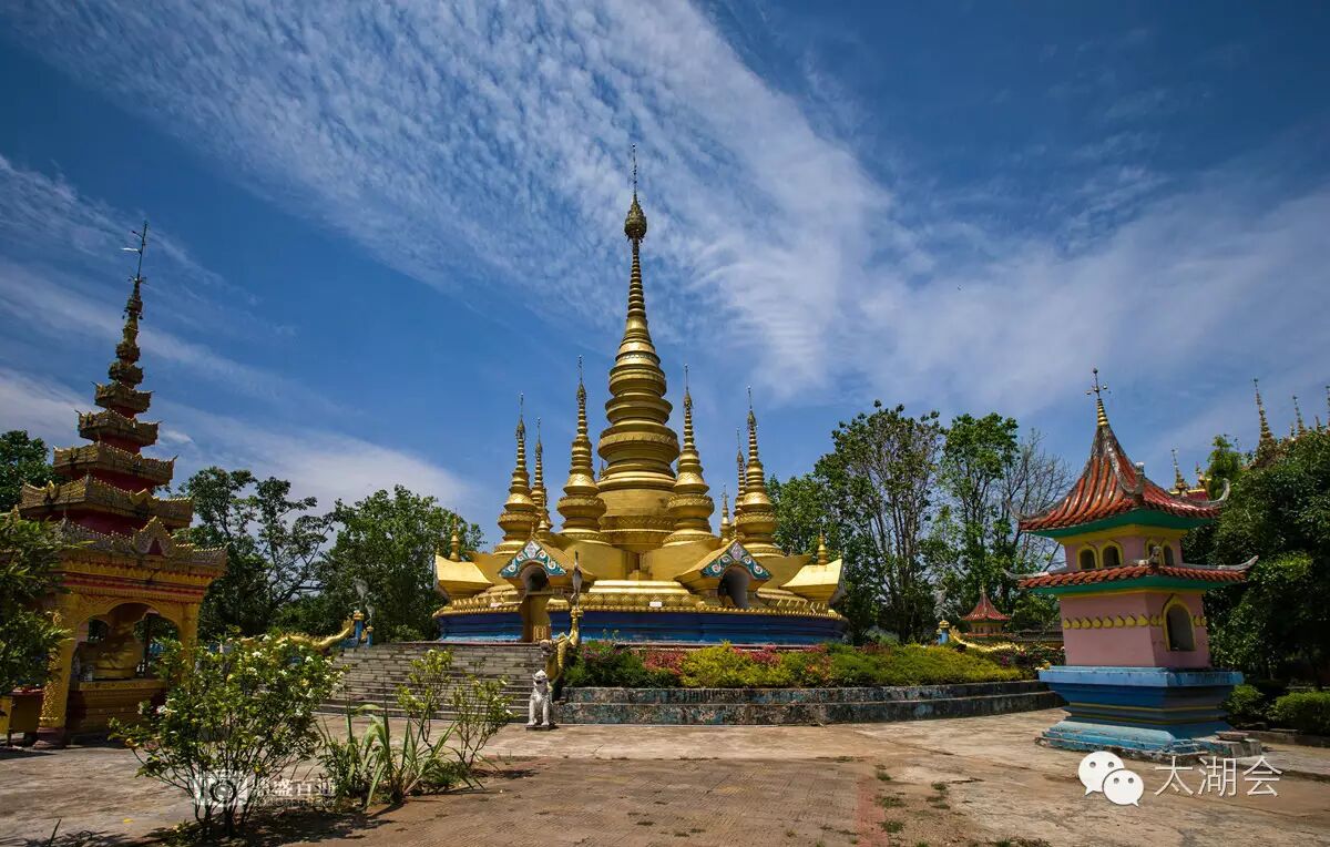 孟连金塔位于南垒河畔,建成于1997年,由8个小塔环抱一个主塔构成,主塔高31.68米。