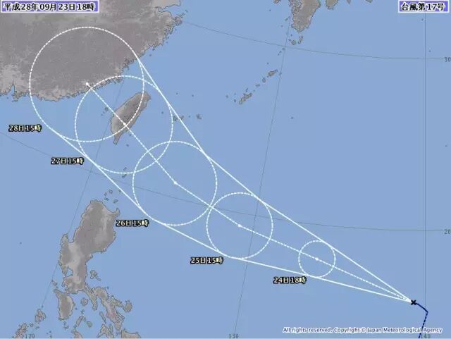中新网9月24日电 ,今年第17号台风“鲇鱼”24日8时加强为强热带风暴,中心位于台湾台东东偏南约1680公里的洋面上,预计未来将以每小时20-25公里的速度向西偏北方向移动,27日前后登陆或擦过台湾南部,28日前后在闽南到粤东一带沿海登陆(11-12级)。