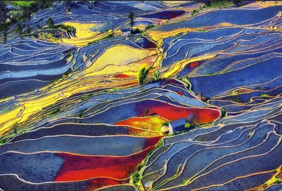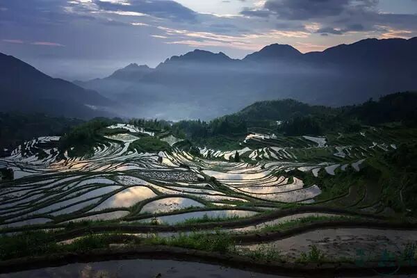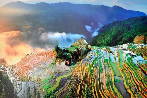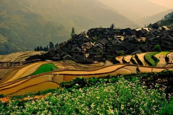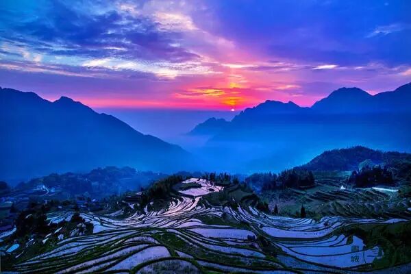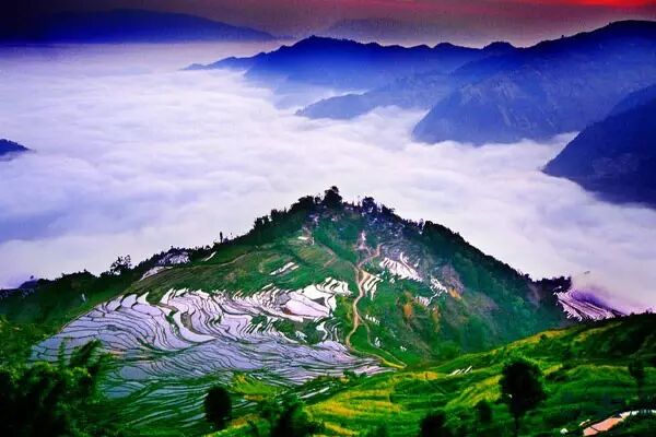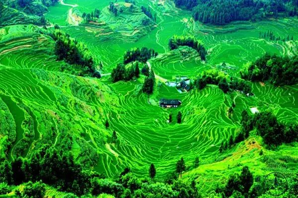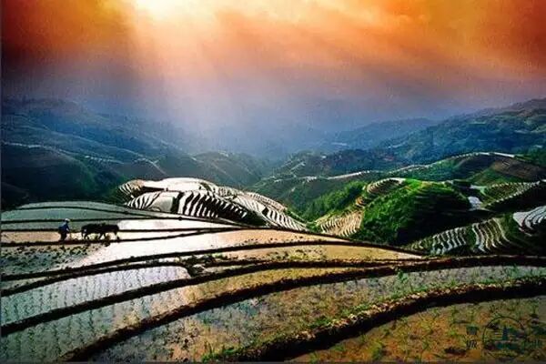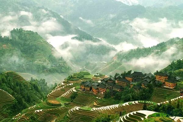 在广西桂林龙胜县和平乡境内,从海拔300米到海拔1100米之间,一层层梯田从山脚盘绕到山顶,高低错落,行云流水,其景色之美,世所罕见。