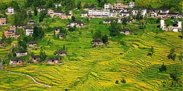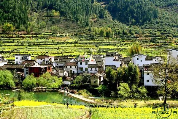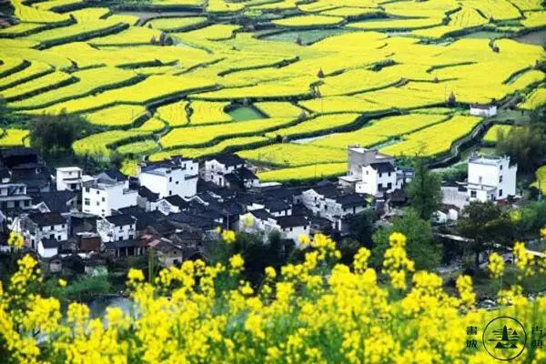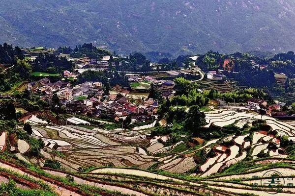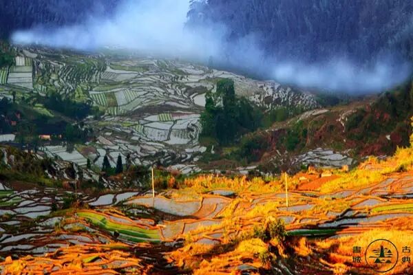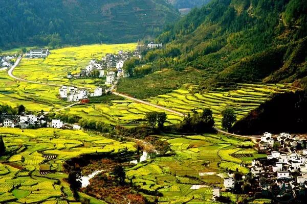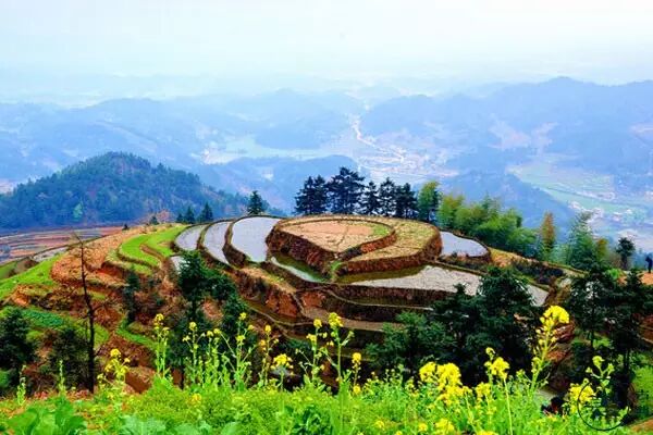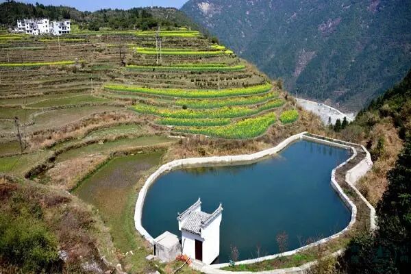海拔千米的高山上,梯田如链似带,水面映着蓝天和古木,白墙黛瓦藏在黄花绿树之中,阵阵云雾飘来,恍若天上人间。