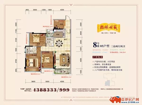 8号楼02户型:三房两厅两卫,建筑面积116.04㎡。纯南向,居住舒适;入户花园可改书房,添加居家功能,彰显主人翁高雅气质。