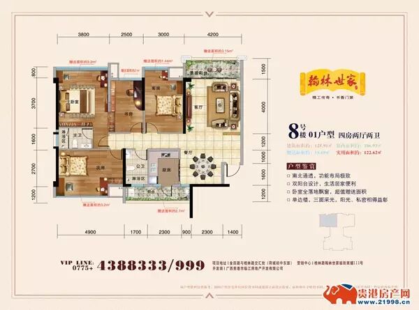 8号楼01户型:四房两厅两卫,建筑面积125.91㎡。南北通透,功能布局精致;单边楼距,三面采光,阳光、私密相得益彰。适合三代同堂一起居住,解决频繁换房的困扰。