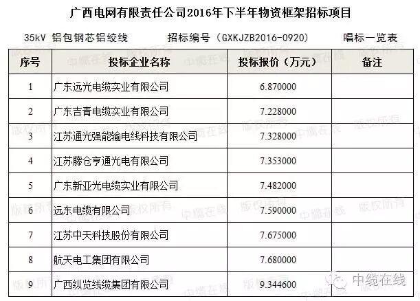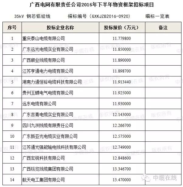 据了解,广西电网有限责任公司2016年下半年物资框架招标项目的招标人为广西电网有限责任公司,招标代理机构为广西电网有限责任公司物流(招标)服务中心。项目建设资金已落实。根据现场唱标,电缆类标段:架空绝缘导线、35kV钢芯铝绞线、35kV 铝包钢芯铝绞线公示如下。