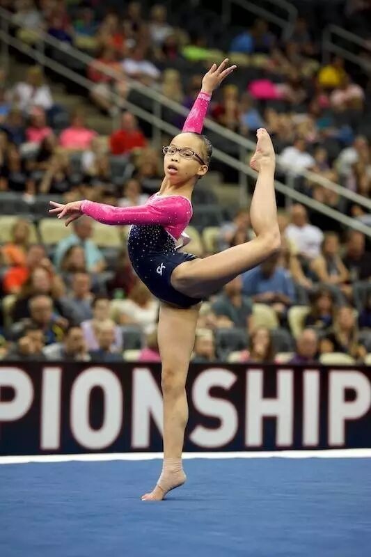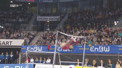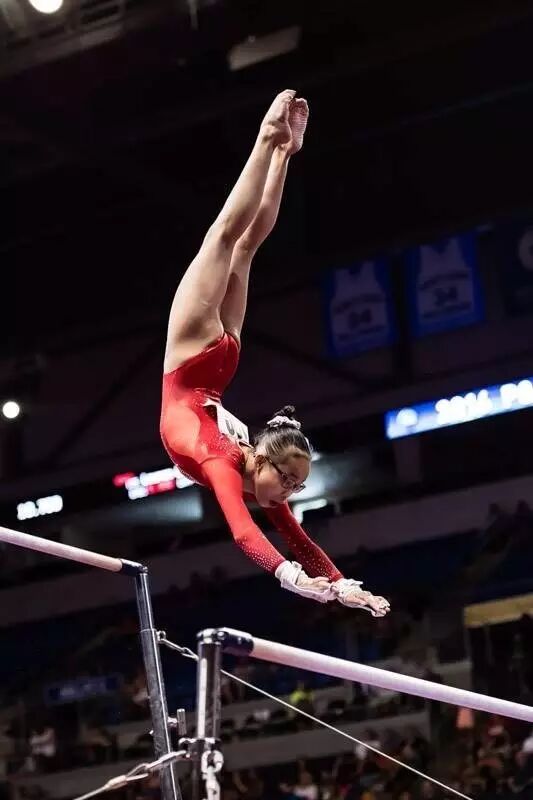 图为“夏松”在体操比赛中,源自《美国体操新势力-Morgan Hurd, 中国孤儿在美国成长》。动图里的“夏松”的跳马一气呵成,高低杠动作也是十分流畅呢,美美哒。
