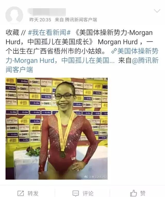 今天(3月22日)早上,阿布留意到有网友在微博转了一条名为《美国体操新势力-Morgan Hurd, 中国孤儿在美国成长》的文章,还介绍说这名体操新秀Morgan Hurd(摩根·赫德)出生于广西梧州。