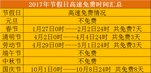 根据国家2017年假期安排,高速公路对小型客车免费通行时间为春节、清明节、劳动节、国庆节等四个国家法定节假日,所以,今年高速公路化身露天停车场大型表演将于以下日子上演: