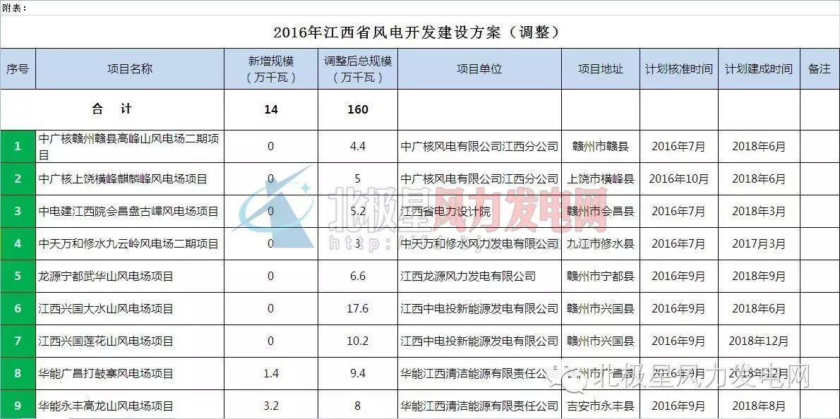 5、江西省能源局调整2016年风电开发建设方案:剩余14万千瓦开发建设规模下达