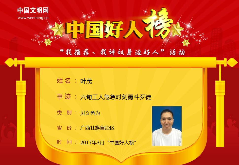 长假后上班第一天,小编获悉,咱们柳州的叶茂当选3月“中国好人榜”见义勇为“中国好人”。
