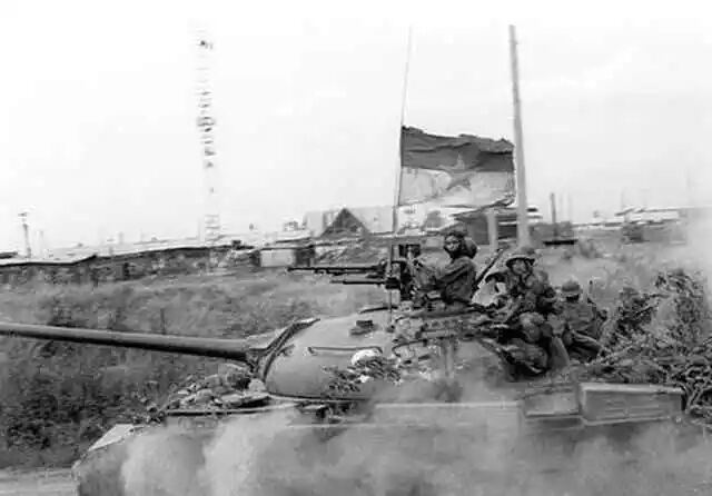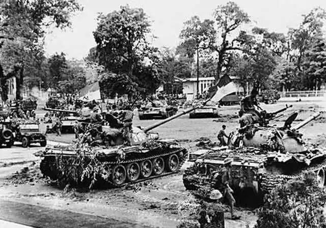 图为越南南方民族解放阵线的坦克(实际为北越部队)攻入南越“总统府”大门,占领总统府以后的坦克乘员合影。如今这辆攻陷“总统府”的中国产59式坦克,在“总统府”大院内作为历史文物供游客参观。1975年4月30日,越南北方军队攻陷位于西贡市中心的南越“总统府”。以此为标志,胡志明及越共领导的抗美救国战争取得了完全胜利,越南获得了统一。四年后,中国和越南从盟友变成仇敌,彻底撕破脸面,大打出手。
