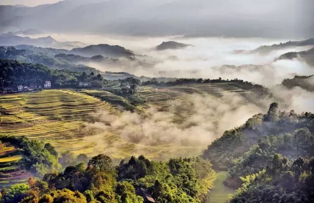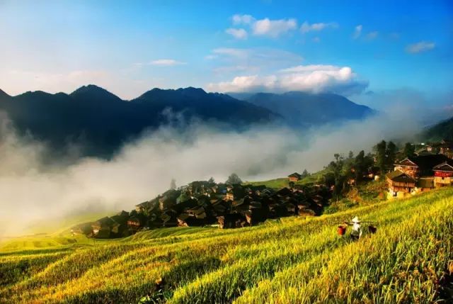 秋天的清晨,阳光初现,可以清晰地看到层层云雾从加榜河上缓缓升起,将金黄色的梯田和古朴的吊脚楼笼罩其中,形成一幅清新脱俗的画卷。