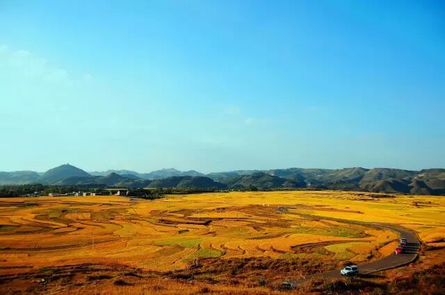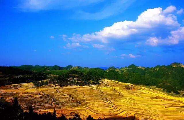 放眼观望,金灿灿、黄澄澄的梯田与蓝天白云互相映衬,构成了这副静逸而美好的画面。