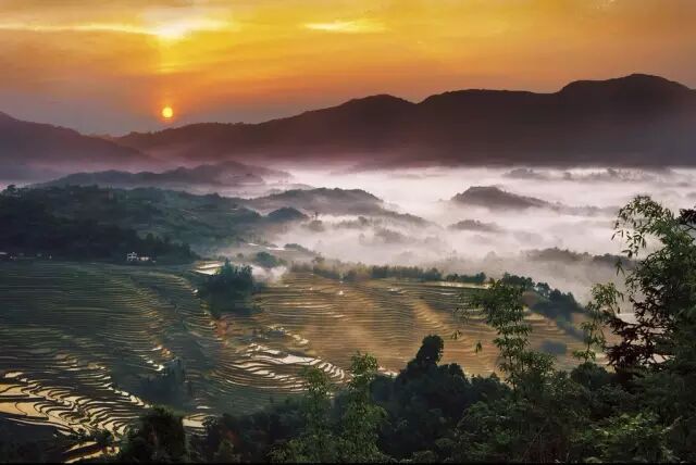 站在山顶上眺望,不仅是远处的朝阳把天边映得一片金黄,那一层层的梯田也在映衬下,变得格外的好看。