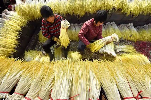 2016年12月1日,山东省沂源县悦庄镇东小水村的农民在整理收获的蒜黄。 摄)