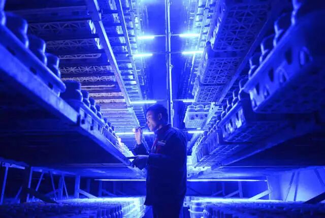 2016年12月2日,在山东邹城友和食用菌基地,一名技术人员在金针菇栽培室观察。 摄)