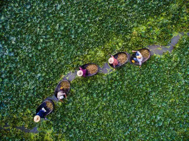 浙江省湖州市吴兴区东林镇的农民们划着木桶,采摘刚成熟的菱角(2016年10月9日摄)。 徐昱 摄