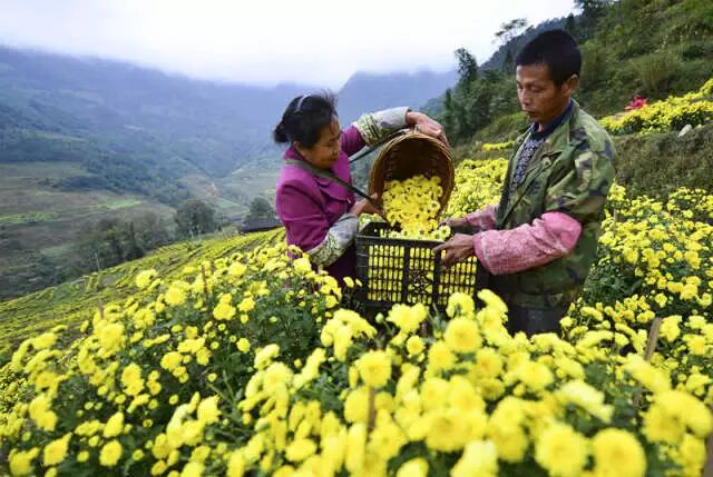 2016年11月2日,广西龙胜各族自治县泗水乡周家村白面瑶寨的花农在采摘皇菊。 摄)