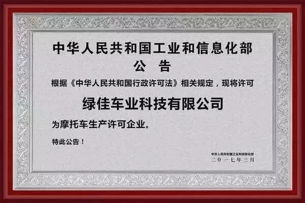 自1999年创业以来,绿佳一直以低调示人,从一家默默无闻的本土品牌发展成为全国性的知名品牌,凭借过硬的品质及强大的渠道网络,赢得了市场的认可与消费者的青睐。如今,绿佳的发展又进了一步,“摩托车生产许可”标志着绿佳产品将实现多元化的发展路线,满足不同消费者的需求,更是企业整体实力向上的一种象征。