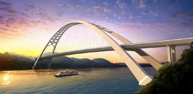 广西柳州官塘大桥在当地有着穿越城市“绿肺”的最美通道之称。据悉该桥为提篮式无系杆钢箱拱桥,主线全长1155米,跨径457米。大桥水中不设桥墩,受力全靠横跨的主拱及两端的拱座基础。拱座基础为钢筋混凝土扩大基础,能承受17500吨水平推力,为当今之最。