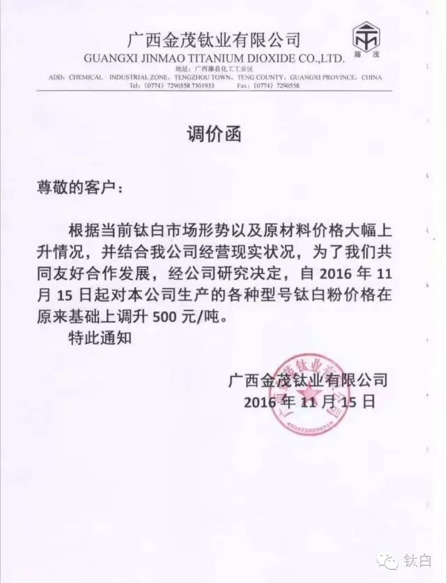 首页 | 美容百科 | 广西金茂钛白宣涨 广西金茂钛白宣涨 2023-04-19 23:50:29 11月15日广西金茂宣布:根据当前钛白市场形势以及原材料价格大幅上升情况,并结合公司经营现实状况,为了我们共同友好合作发展,经公司研究决定,自2016年11月15日起对公司生产的各种型号钛白粉价格在原来基础上调升500元/吨。