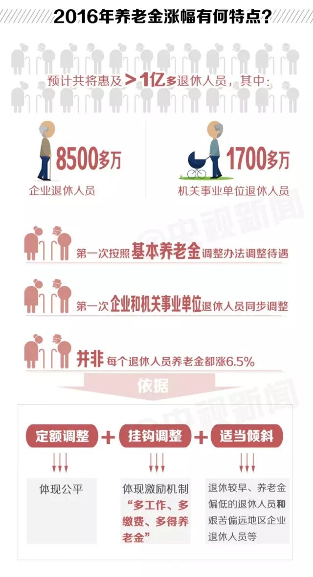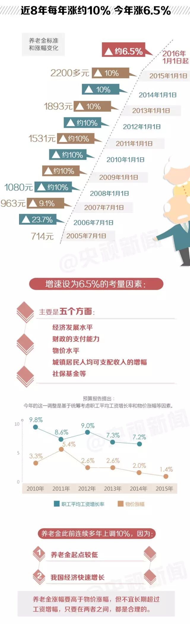 日前,人社部和财政部印发《关于2016年调整退休人员基本养老金的通知》,确定从今年1月1日开始提高退休人员基本养老金水平6.5个百分点。
