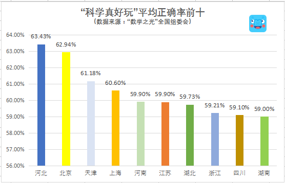 另外,在反映全国小学生科学思维能力的“科学真好玩”小象历险记板块,各省市区的平均每人正确率也只有59.26%,尚未达到60%的及格线。