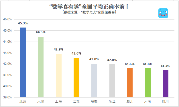 例如,旨在考察小学生数学思维能力的“数学真有趣”趣味挑战板块,各省市区的平均每人正确率只有40.7%,其中排名第一位者的北京,平均每人正确率也仅为45.3%,显示全国小学生在数学思维发散上,总体表现不佳。“这个结果,与稍早之前结束的GMC世界趣味数学挑战赛的结果一致,都体现出了我们在数学思维培养上的弱势。”作业盒子联合创始人贾晓明表示。据了解,作业盒子小学版产品—速算盒子也参与了GMC中国地区的活动主办。