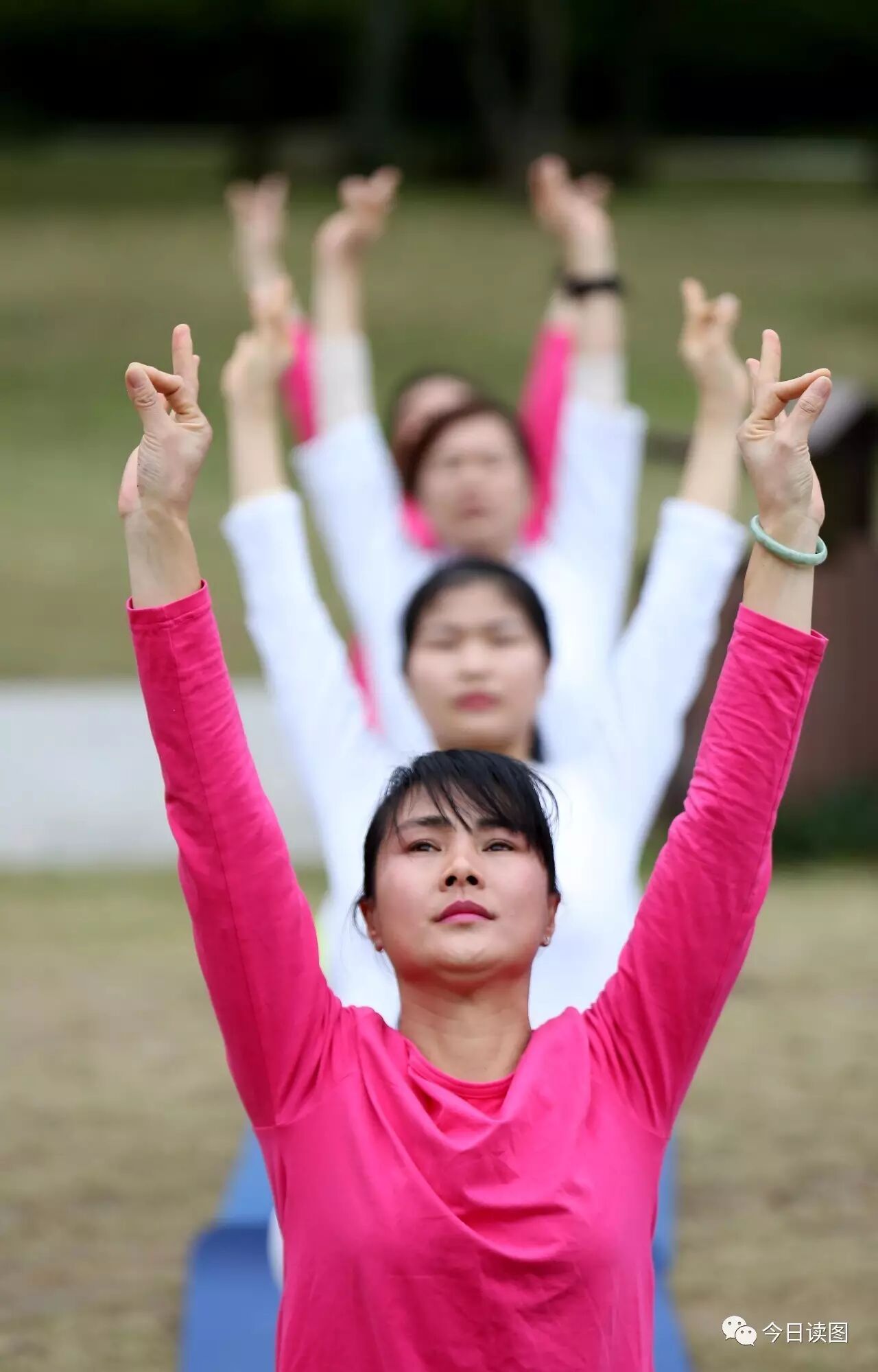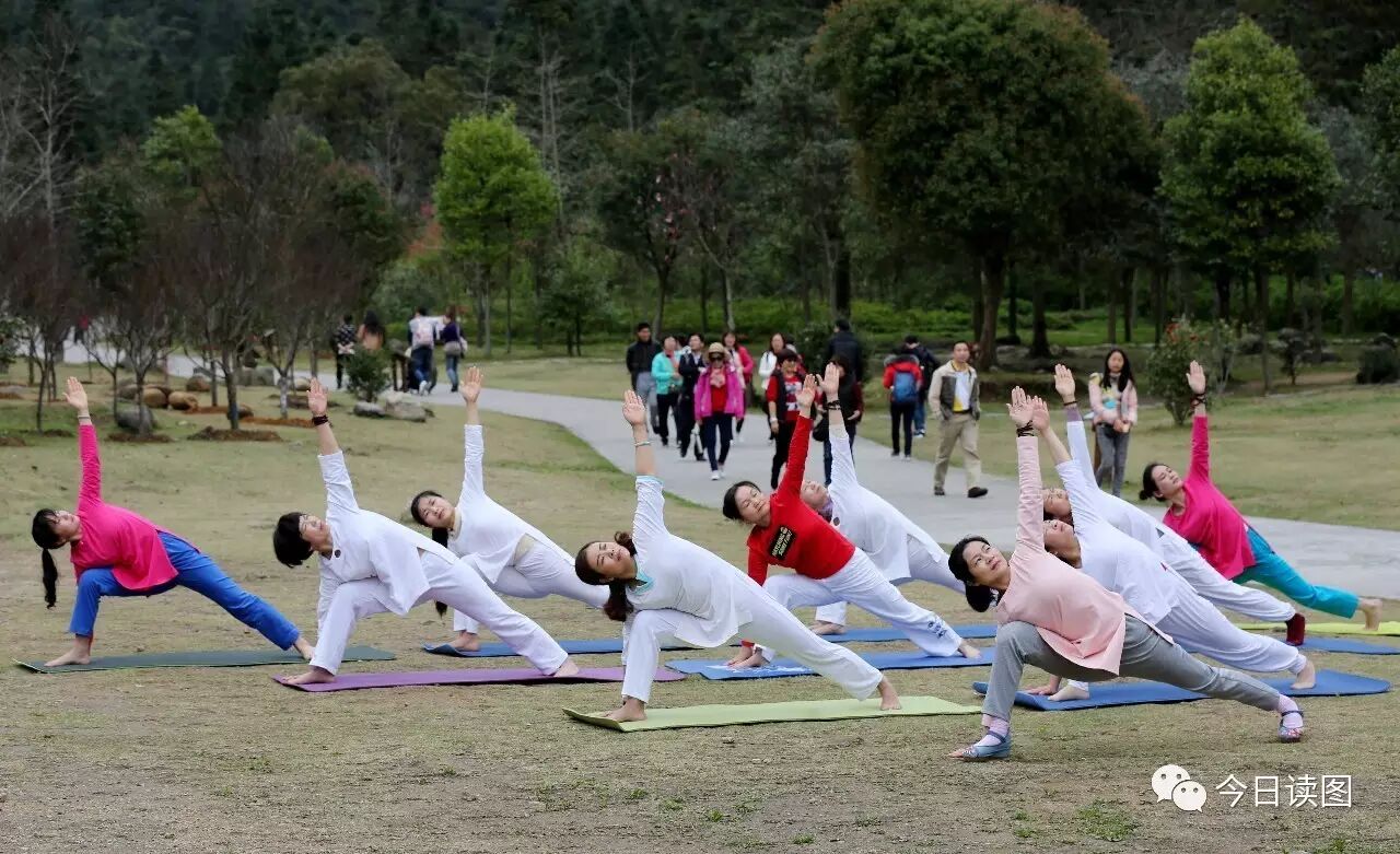 ↑瑜伽爱好者在广西贺州市姑婆山国家森林公园秀瑜伽。