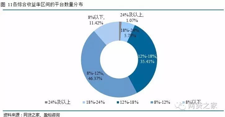 主流综合收益率区间仍分布在8%-12%,平台占比为46.37%;其次为综合收益率在12%-18%的平台,占比为35.41%,8%以下低息平台占比继续增加,为11.42%。