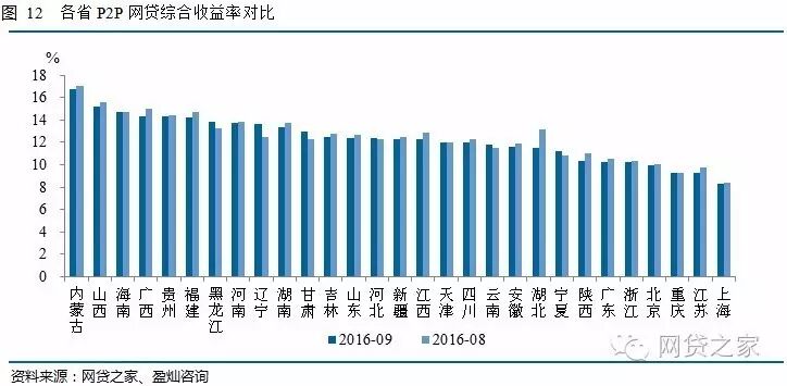9月份进入统计的全国29个省市中,仅上海、江苏和重庆综合收益率低于全国水平(9.83%),分别为8.33%、9.23%和9.25%。北京综合收益率稍高于全国水平,为9.91%。综合收益率最高的三省市分别是内蒙古、山西和海南,分别为16.73%、15.26%和14.68%