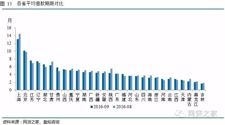 9月进入统计的全国29个省市中,仅上海和北京的平均借款期限长于行业平均水平(7.75个月),分别为13.07、10.1个月。有18个省市的平均借款期限缩短。借款期限较短的三省市是吉林、黑龙江和内蒙古,分别为1.62、2.02、2.13个月,分别环比缩短了0.17、0.18和0.72个月。
