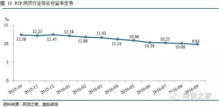 今日,网贷之家联合盈灿咨询发布《P2P网贷行业2016年9月月报》,月报数据显示,2016年9月,网贷行业综合收益率首次跌破10%,为9.83%,环比下降了25个基点(1个基点=0.01%),同比下降了280个基点。《暂行办法》出台后,网贷平台资产端竞争加剧且合规调整成本增大,部分平台主动下调综合收益率,行业综合收益率相应下行。