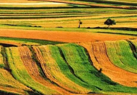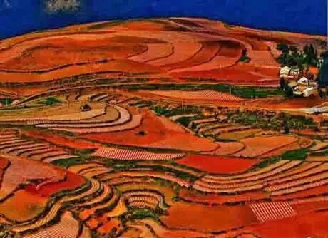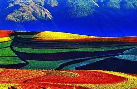 火红的泥土、变色的植物,各异的形状、优美的线条,衬以蓝天、白云和那变幻莫测的光线,东川红土地就是一幅绚烂的变色油画!尤其是每年9月,这方土地点缀着各种成熟的作物,五彩斑斓,若再笼罩上一层薄薄的雾气,更是仙境一般。