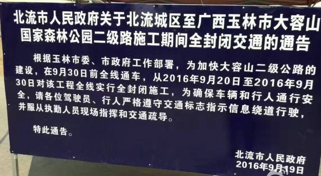 目前,为加快大容山二级公路的建设,从2016年9月20日至2016年9月30日对该工程全线实行全封闭施工,将在9月30日前全线通车。