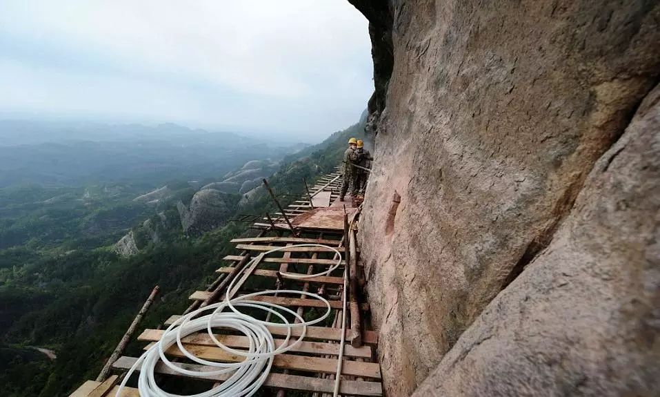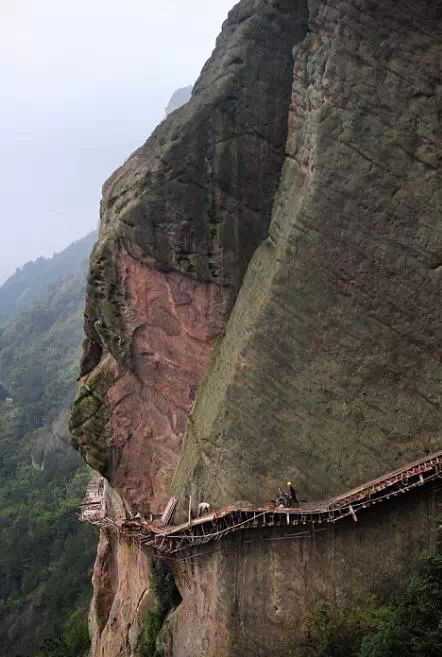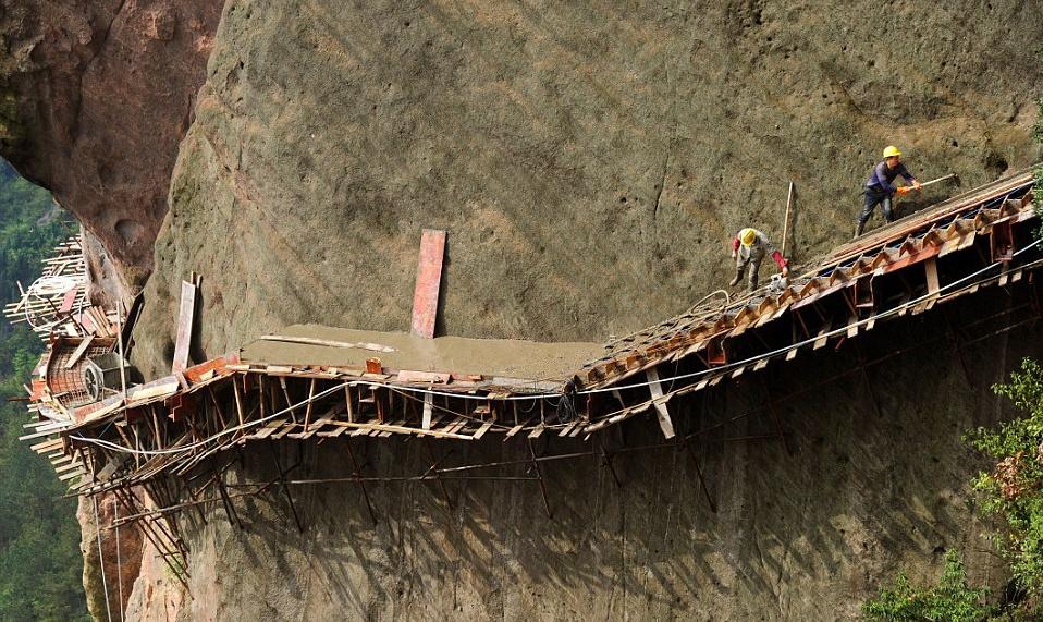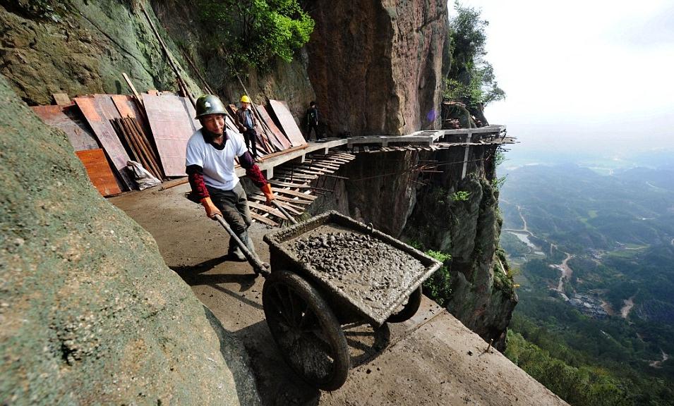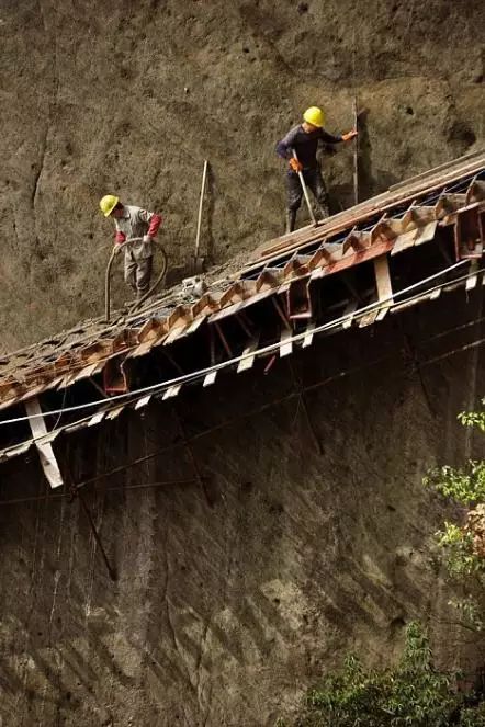 工人们背着沉重的木板,推着满载混泥土的推车,穿过搭建在几千英尺(1英尺=0.3048米)空中的木板路运输修路所需的材料。