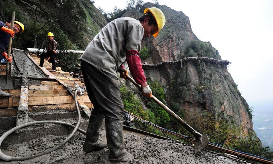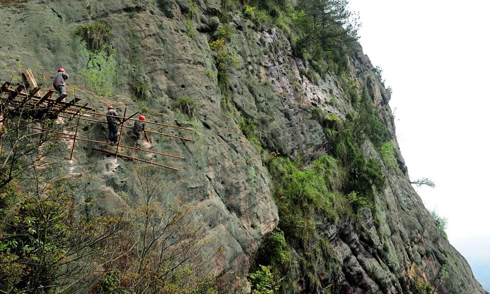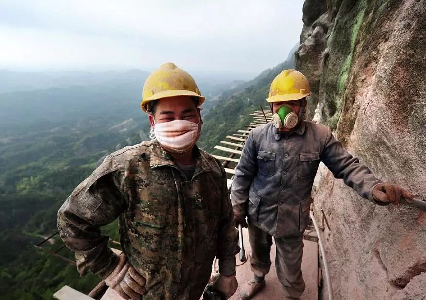 地面作业可以使用大型机械,在悬崖峭壁上修栈道则全部靠人力。