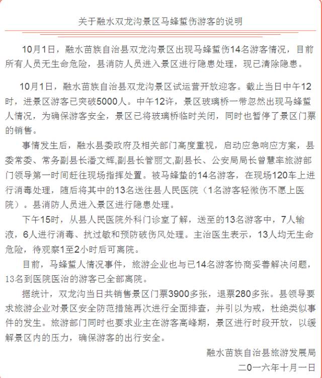 昨天隔壁老王的融水双龙沟景区超级火爆,就一个上午售票即达到5000!庞大的数字!虽然中午爆出游客被野黄蜂蛰伤事件,但事件得已解决,算是小插曲吧,同时融水地方政府也启动了相关的应急措施!(文章中有好消息哦,请继续看)