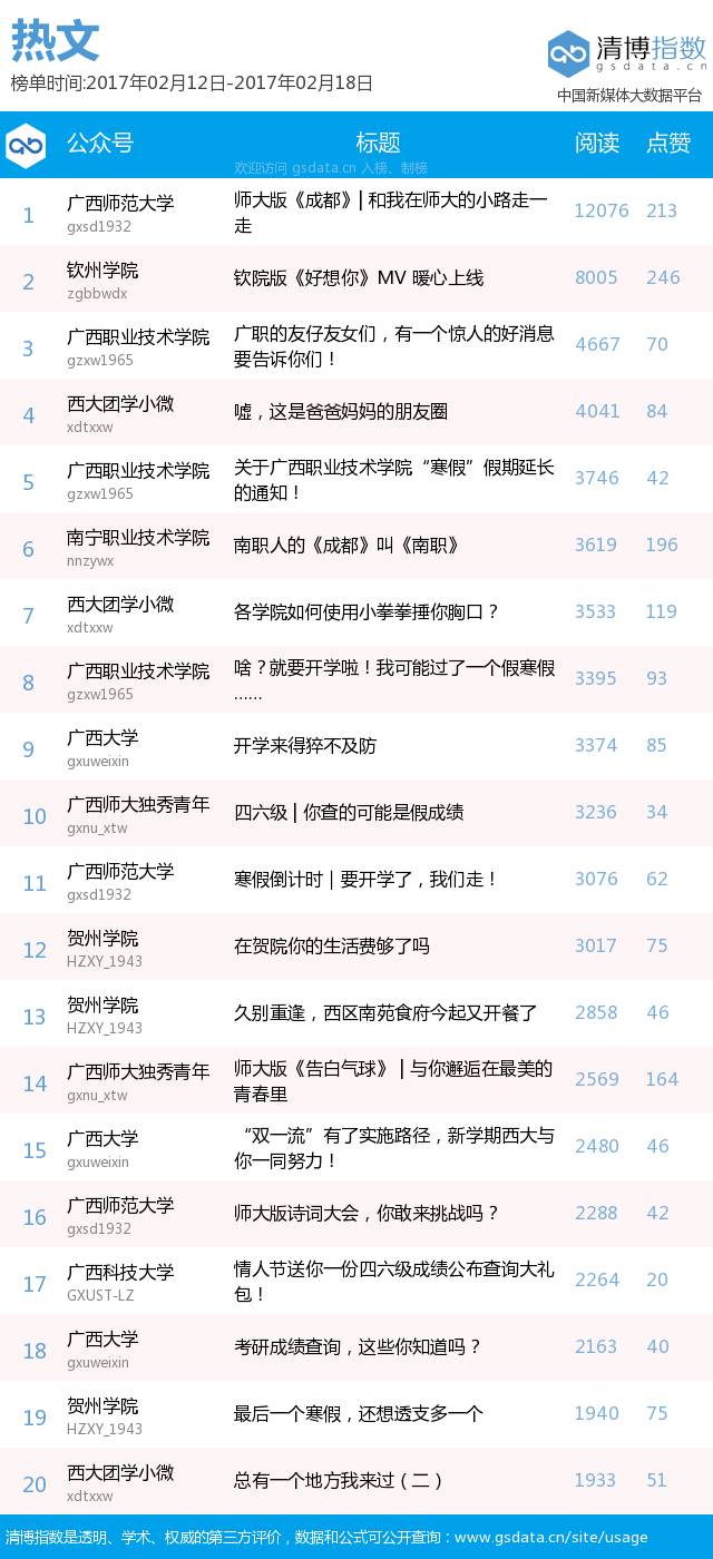 3、 本次的榜单,以2017年2月12日-2月18日所发布的微信内容为统计范围,依据微信指数WCI为最终统计标准制作而成。
