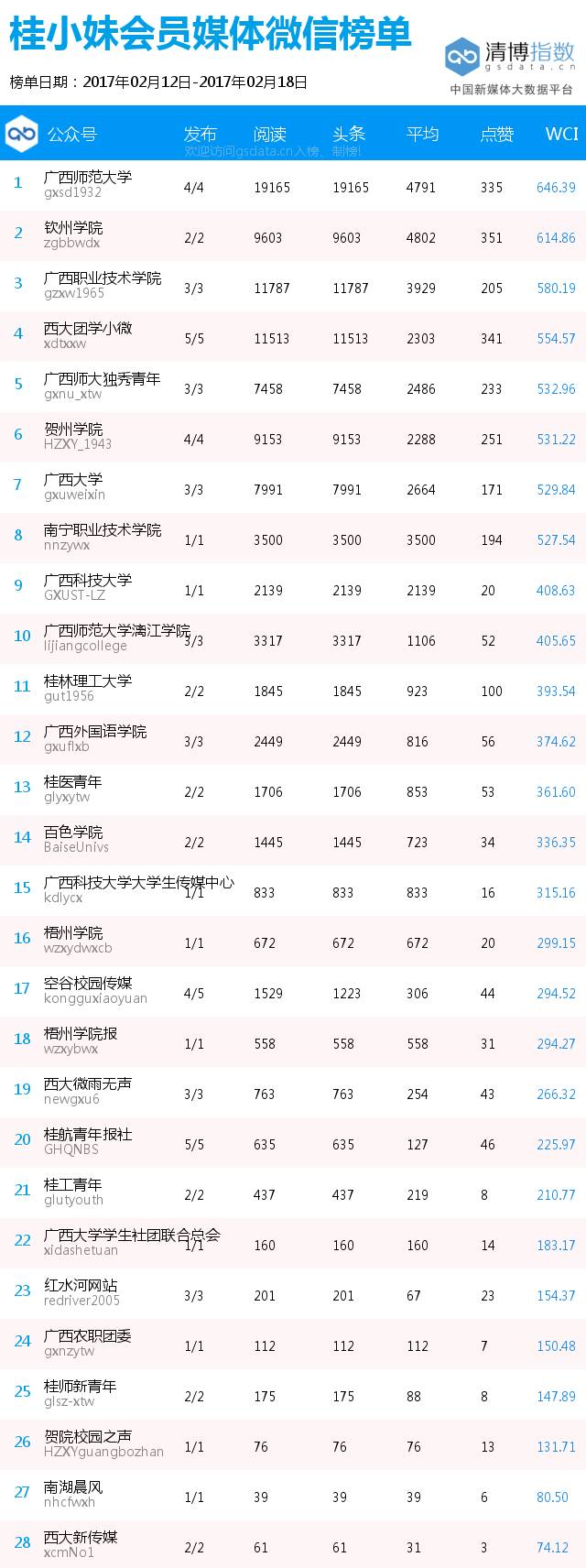 1、中国(广西)高校传媒联盟是国内第一个少数民族自治区高校传媒联盟,由团区委和中国青年报社广西记者站联合指导,隶属于中国高校传媒联盟。成立以来一直践行为各高校媒体传递综合媒体动态的宗旨,打造一个供各高校会员媒体相互交流、学习探讨和共同进步的平台。新媒体时代正以迅猛的速度覆盖人们的生活,为促进广西校媒会员媒体的更好发展,中国(广西)高校传媒联盟将在每周一推出《桂小妹会员媒体微信公众号综合影响力排行榜》,希望可以通过排行榜提升会员媒体的竞争意识,引导会员媒体的发展方向,促进会员媒体的交流和发展。